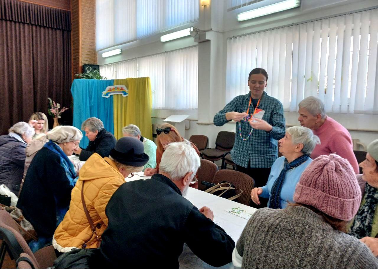 У залі запанувала справжня атмосфера творчості і натхнення: люди літнього віку вчилися створювати оригінальні прикраси з різнокольорового бісеру.