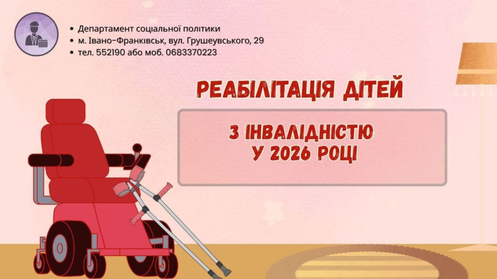 Інформуємо, що на 2026 рік Департаменту соціальної політики виконкому Івано-Франківської міської ради виділено кошти з держбюджету для реабілітації дітей з інвалідністю у сумі 2 671 400,00 гривень (два мільйони шістсот сімдесят одну тисячу чотириста гривень 00 копійок). З початку року у порядку черговості та в межах кошторисного призначення укладено 7 двосторонніх договорів з реабілітаційними установами на суму 138 830,00 гривень.