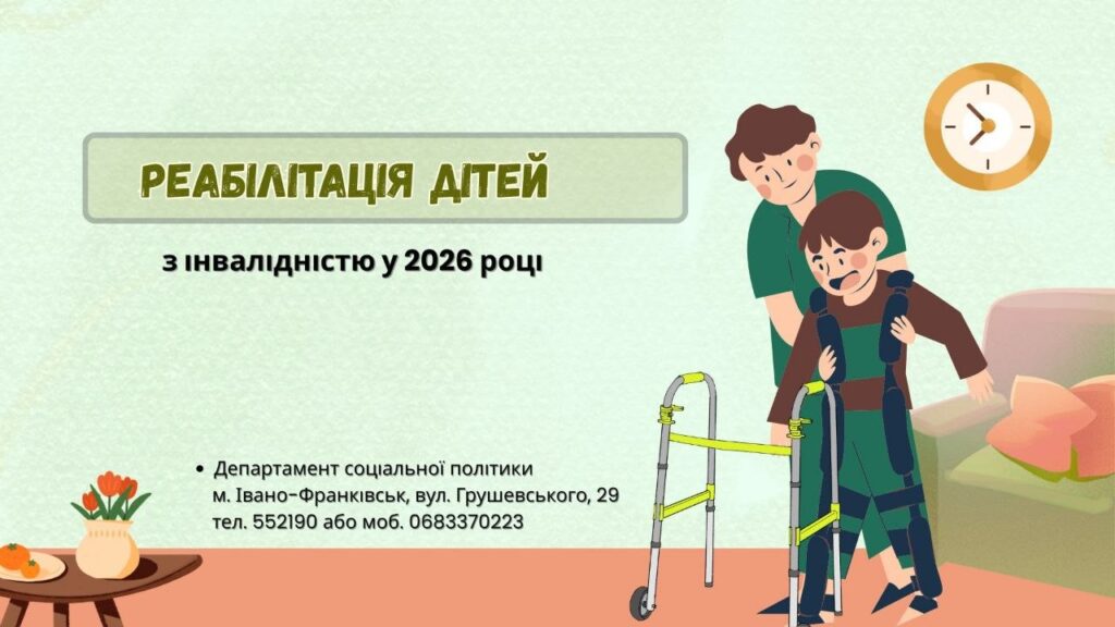 Інформуємо, що на 2026 рік Департаменту соціальної політики виконкому Івано-Франківської міської ради виділено кошти з держбюджету для реабілітації дітей з інвалідністю у сумі 3 513 100,00 гривень. З початку року у порядку черговості та в межах кошторисного призначення укладено 68 двосторонніх договорів з реабілітаційними установами на суму 1 388 530,00 гривень. Наразі 11 дітей вже пройшли реабілітаційні послуги.